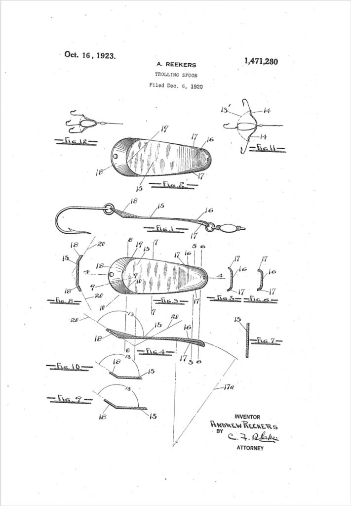 This is the patent for a trolling spoon Andy Reekers filed on December 6, 1920. The patent was issued on October 16, 1923, and the spoon became known as the “Andy Reekers”.