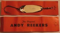I have two Andy Reekers of interest, not for sale, but very interesting. The first is a size 7, made of brass with nickel plating all over, its just less than 1/8″ thick, the body of the spoon is 4-1/16″ long by 1-5/8″ at its widest, and overall length including the large treble hook and front swivel, measures 7-3/4″ long. The second is a size 8, a very thin trolling lure, maybe a 1/32″ thick, the body is 4 9/16″ in length and 1-9/16″ at its widest. Overall length is 8-7/8″. These were in my father’s collection for decades. I never saw them, not until he gave me a bunch of his old fishing gear about 15 years ago. I’ll have them in my collection, at least for the next 30 years, if I live that long! 🙂